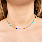 Moderno, delicado y lindo collar choker con cristales de colores enchapado en oro de 18K. Fabricado en bronce y enchapado en oro de 18K. La calidad del material es garantizada, hipoalergénico y no posee níquel.